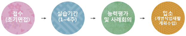 직업적응훈련 | 일상생활 직업준비, 수행적응훈련, 사회적응훈련, 작업태도 및 직무기능 훈련 여가 및 특별활동프로그램 실시 |